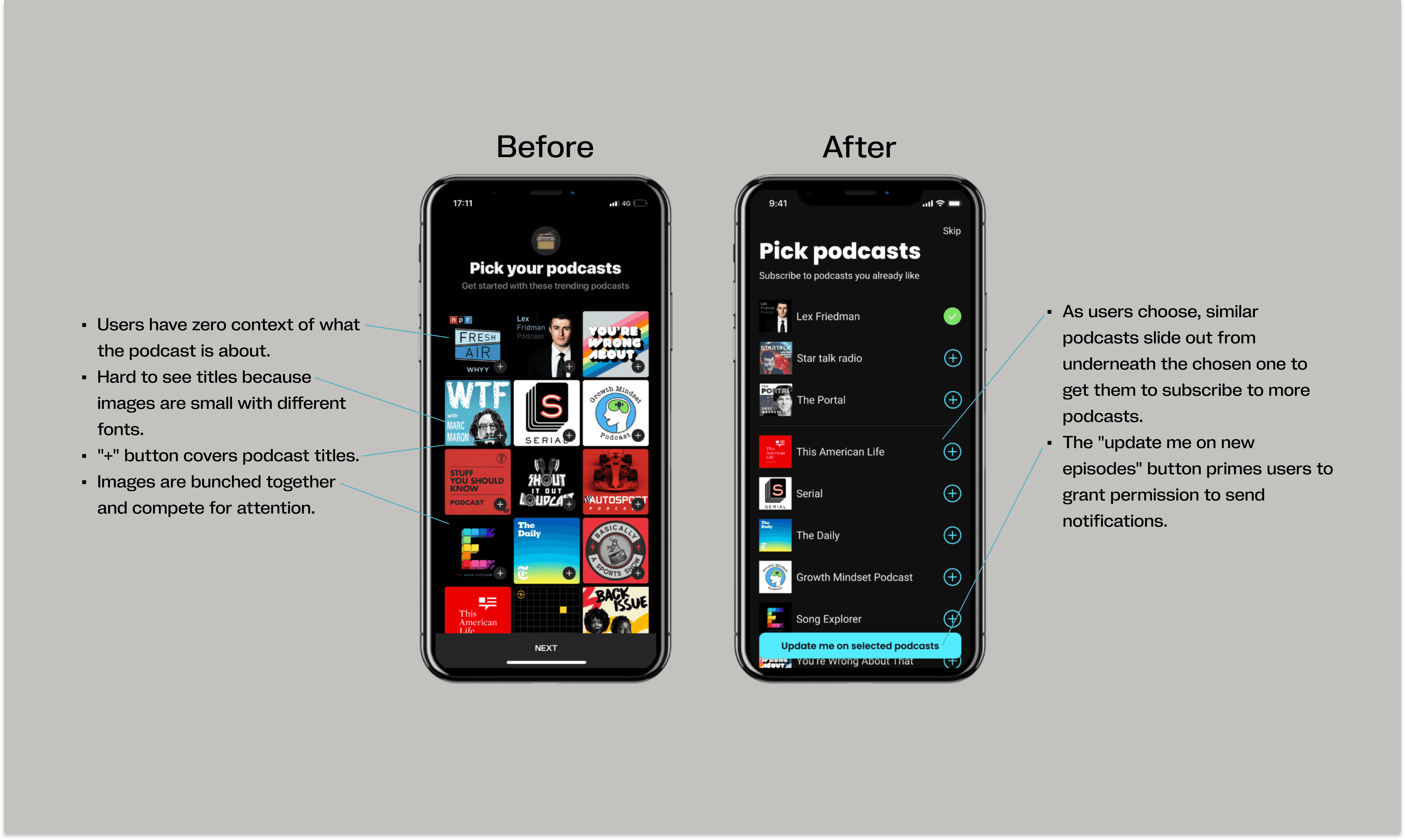 Refactoring an onboarding experience for a podcasting social network, yielding a 30% jump in conversions.