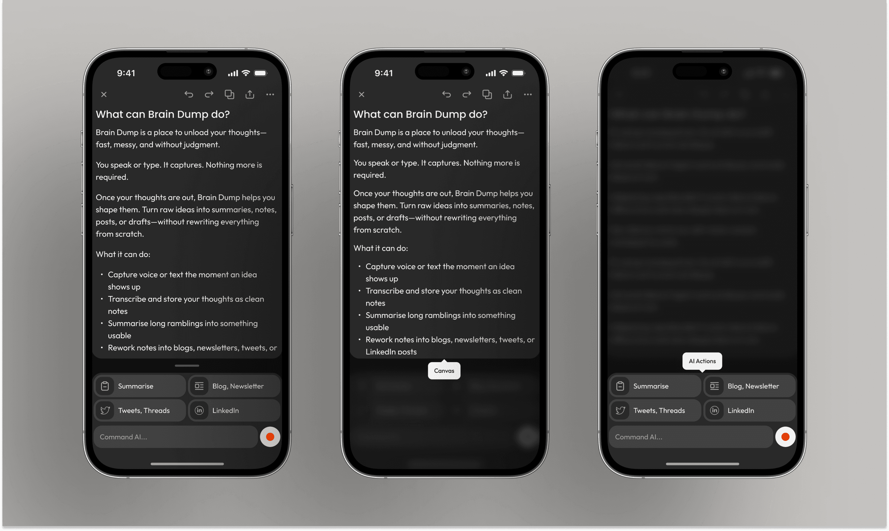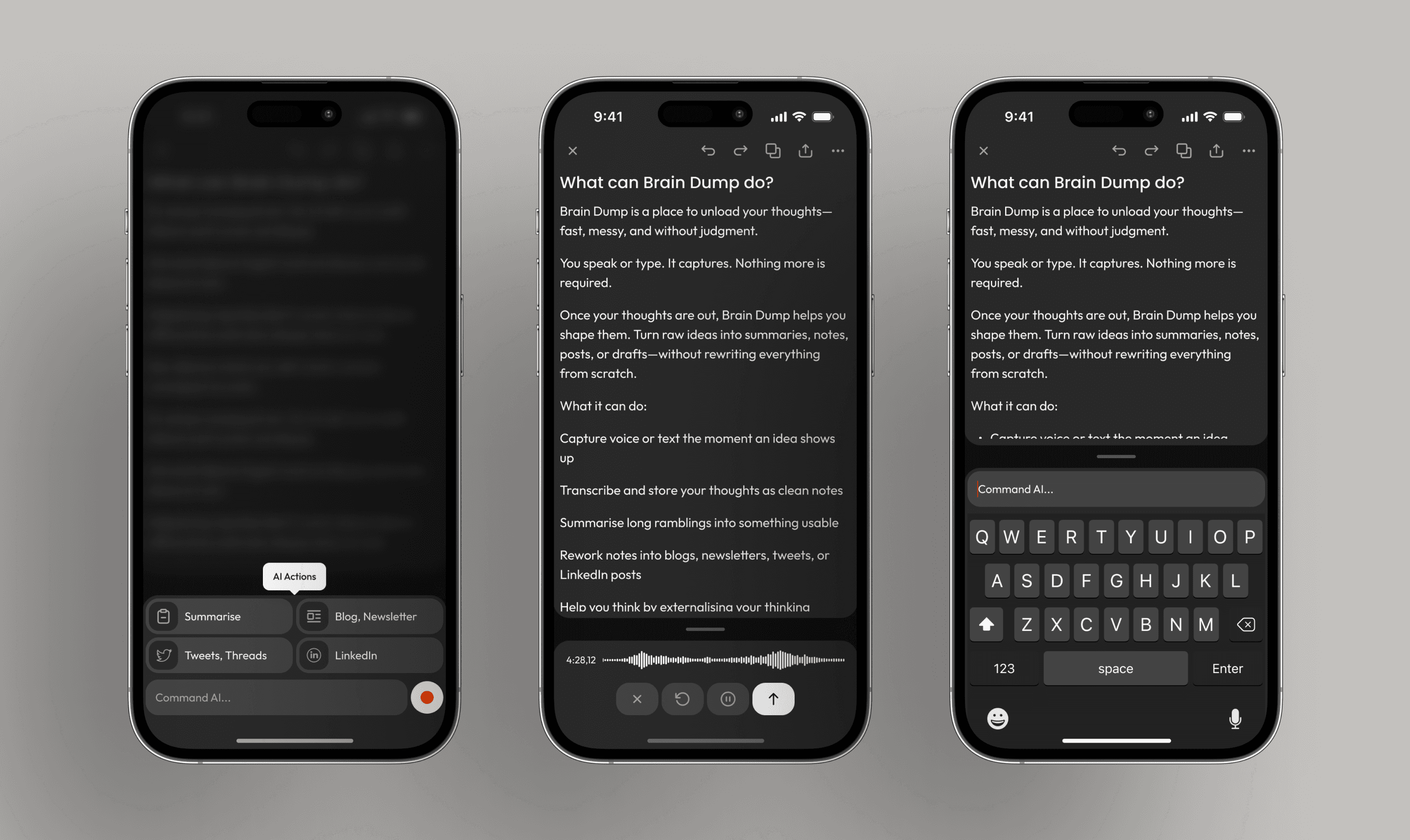 Brain Dump is a voice-first notes app for capturing unstructured thoughts. I took it from 0 → 1, owning problem definition, scope decisions, design, and distribution and validating the idea with real users.